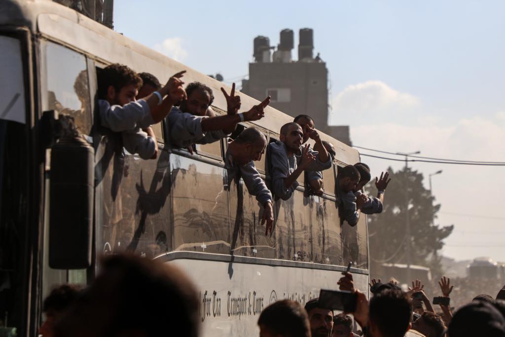 10月13日,巴勒斯坦获释人员乘坐大巴回到加沙地带南部汗尤尼斯。新华社发(里泽克·阿卜杜勒贾瓦德 摄)